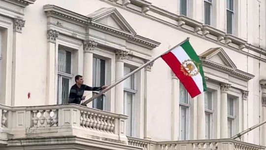 Tensión en la embajada de Irán en Londres: un manifestante izó la bandera preislámica durante una protesta contra el régimen